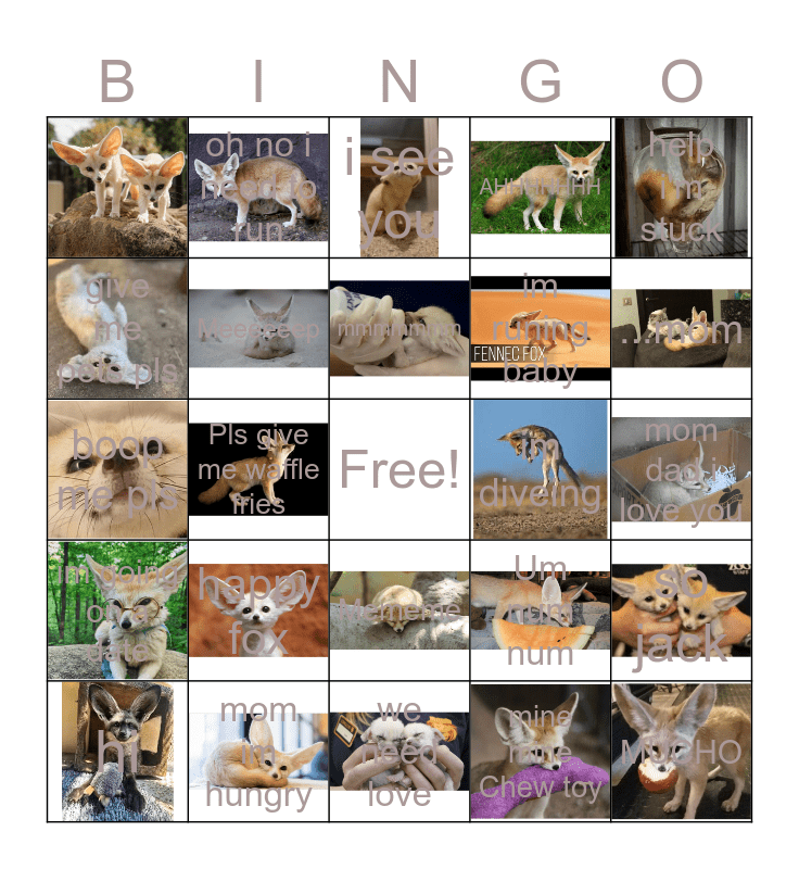 This bingo card has 24 images, a free space and 23 words: happy fox, mom im hungry, mmmmmmm, hi, help i'm stuck, give me pets pls, oh no i need to run, im diveing, Mememe, im runing baby, boop me pls, Um num num, so jack, Meeeeeep, mine mine Chew toy, mom dad i love you, i see you, ...mom, Pls give me waffle fries, MUCHO, im going on a date, AHHHHHHH and we need love.