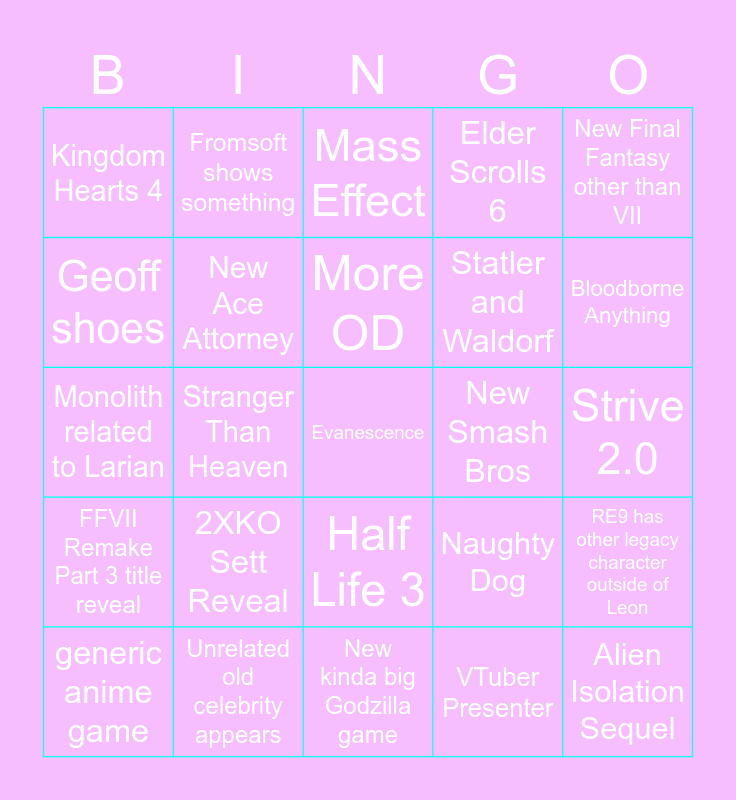 This bingo card has a free space and 24 words: 2XKO Sett Reveal, Unrelated old celebrity appears, More OD, generic anime game, New Final Fantasy other than VII, Kingdom Hearts 4, Geoff shoes, Fromsoft shows something, New Smash Bros, Half Life 3, Statler and Waldorf, Monolith related to Larian, Naughty Dog, RE9 has other legacy character outside of Leon, New Ace Attorney, VTuber Presenter, Strive 2.0, Mass Effect, Bloodborne Anything, Stranger Than Heaven, Alien Isolation Sequel, FFVII Remake Part 3 title reveal, Elder Scrolls 6 and New kinda big Godzilla game.