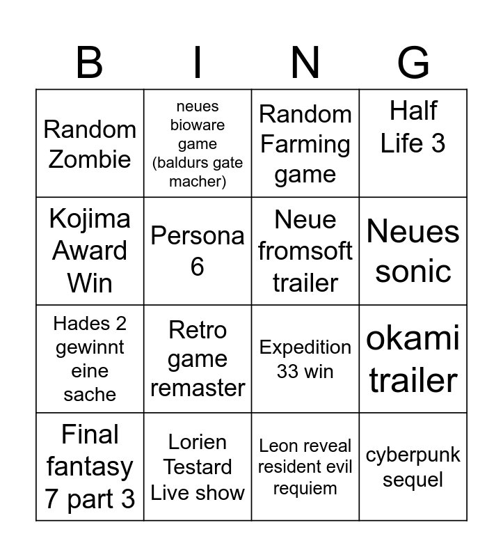 This bingo card has 16 words: Lorien Testard Live show, okami trailer, Random Farming game, Random Zombie, Hades 2 gewinnt eine sache, neues bioware game (baldurs gate macher), Expedition 33 win, Leon reveal resident evil requiem, Kojima Award Win, Persona 6, Final fantasy 7 part 3, Half Life 3, Retro game remaster, Neues sonic, Neue fromsoft trailer and cyberpunk sequel.