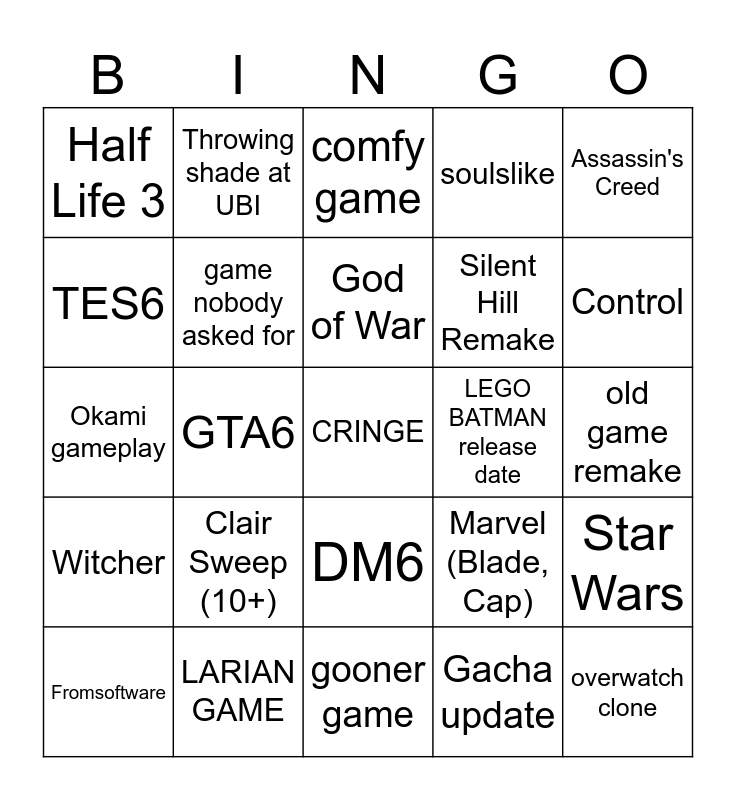 This bingo card has a free space and 24 words: Clair Sweep (10+), LARIAN GAME, God of War, Fromsoftware, Assassin's Creed, Half Life 3, TES6, Throwing shade at UBI, LEGO BATMAN release date, DM6, Silent Hill Remake, Okami gameplay, Marvel (Blade, Cap), Star Wars, game nobody asked for, Gacha update, old game remake, comfy game, Control, GTA6, overwatch clone, Witcher, soulslike and gooner game.