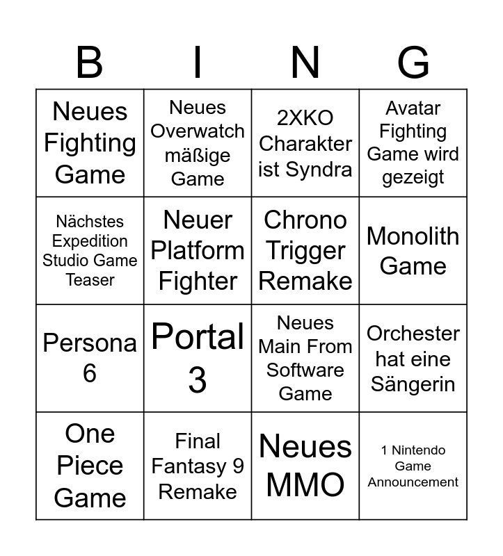This bingo card has 16 words: Final Fantasy 9 Remake, Orchester hat eine Sängerin, 2XKO Charakter ist Syndra, Neues Fighting Game, Persona 6, Neues Overwatch mäßige Game, Neues Main From Software Game, Neues MMO, Nächstes Expedition Studio Game Teaser, Neuer Platform Fighter, One Piece Game, Avatar Fighting Game wird gezeigt, Portal 3, Monolith Game, Chrono Trigger Remake and 1 Nintendo Game Announcement.