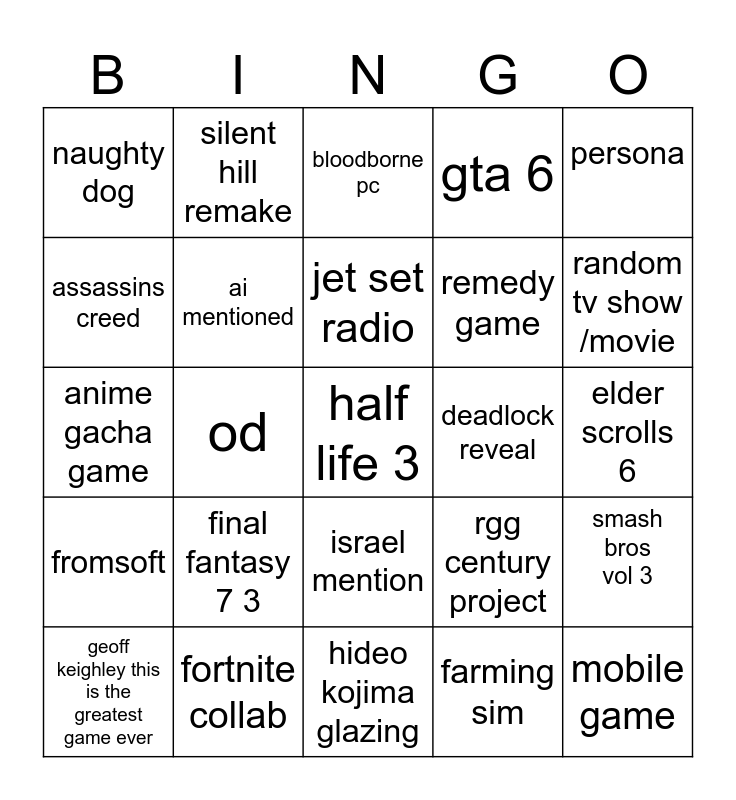 This bingo card has a free space and 24 words: final fantasy 7 3, fortnite collab, jet set radio, geoff keighley this is the greatest game ever, persona, naughty dog, assassins creed, silent hill remake, deadlock reveal, israel mention, remedy game, anime gacha game, rgg century project, smash bros vol 3, ai mentioned, farming sim, elder scrolls 6, bloodborne pc, random tv show /movie, od, mobile game, fromsoft, gta 6 and hideo kojima glazing.