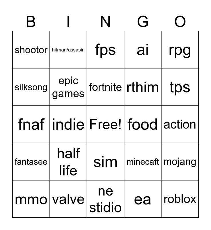 This bingo card has a free space and 24 words: half life, valve, fortnite, mmo, rpg, shootor, silksong, hitman/assasin, food, sim, rthim, fnaf, minecaft, mojang, epic games, ea, action, fps, tps, indie, roblox, fantasee, ai and ne stidio.