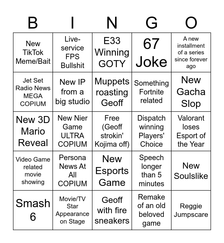 This bingo card has a free space and 24 words: Smash 6, Persona News At All COPIUM, Muppets roasting Geoff, Remake of an old beloved game, A new installment of a series since forever ago, New TikTok Meme/Bait, Live-service FPS Bullshit, E33 Winning GOTY, Dispatch winning Players' Choice, Valorant loses Esport of the Year, New 3D Mario Reveal, New IP from a big studio, Speech longer than 5 minutes, New Soulslike, Jet Set Radio News MEGA COPIUM, Movie/TV Star Appearance on Stage, Geoff with fire sneakers, 67 Joke, New Gacha Slop, Video Game related movie showing, New Nier Game ULTRA COPIUM, New Esports Game, Something Fortnite related and Reggie Jumpscare.