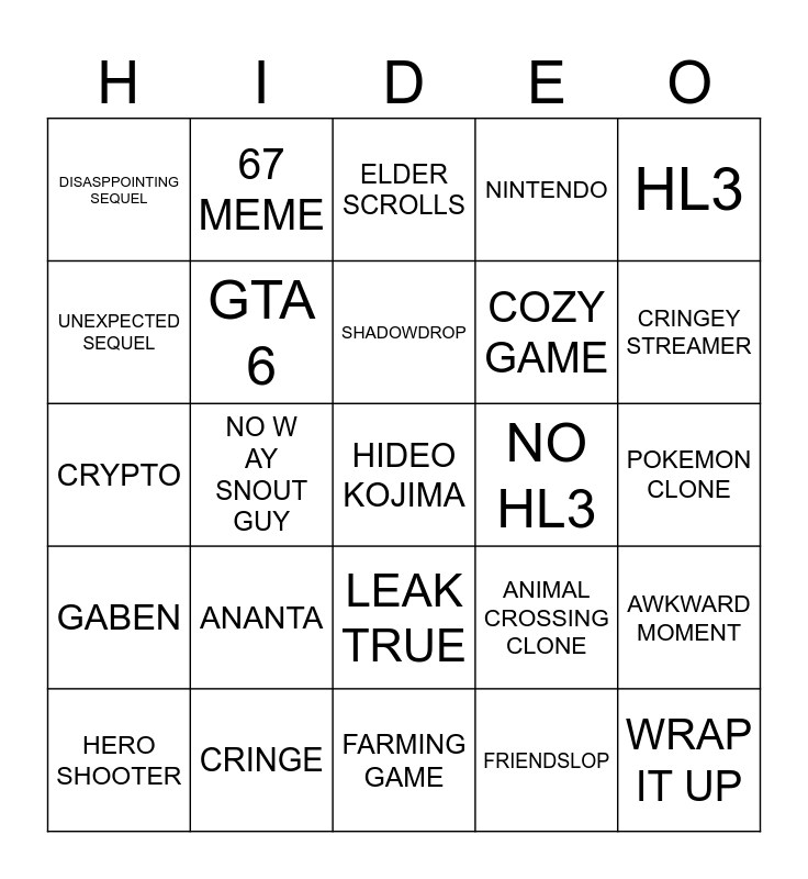 This bingo card has a free space and 24 words: ANANTA, CRINGE, SHADOWDROP, HERO SHOOTER, HL3, DISASPPOINTING SEQUEL, UNEXPECTED SEQUEL, 67 MEME, NO HL3, LEAK TRUE, COZY GAME, CRYPTO, ANIMAL CROSSING CLONE, AWKWARD MOMENT, GTA 6, FRIENDSLOP, POKEMON CLONE, ELDER SCROLLS, CRINGEY STREAMER, NO WAY SNOUT GUY, WRAP IT UP, GABEN, NINTENDO and FARMING GAME.