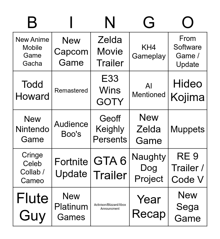 This bingo card has a free space and 24 words: Fortnite Update, New Platinum Games, E33 Wins GOTY, Flute Guy, From Software Game / Update, New Anime Mobile Game Gacha, Todd Howard, New Capcom Game, New Zelda Game, GTA 6 Trailer, AI Mentioned, New Nintendo Game, Naughty Dog Project, RE 9 Trailer / Code V, Remastered, Year Recap, Muppets, Zelda Movie Trailer, Hideo Kojima, Audience Boo's, New Sega Game, Cringe Celeb Collab / Cameo, KH4 Gameplay and Activison/Blizzard/Xbox Announcment.