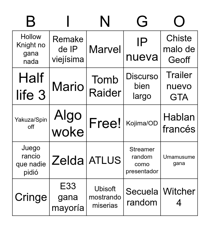 This bingo card has a free space and 24 words: Zelda, E33 gana mayoría, Tomb Raider, Cringe, Chiste malo de Geoff, Hollow Knight no gana nada, Half life 3, Remake de IP viejísima, Kojima/OD, ATLUS, Discurso bien largo, Yakuza/Spin off, Streamer random como presentador, Umamusume gana, Mario, Secuela random, Hablan francés, Marvel, Trailer nuevo GTA, Algo woke, Witcher 4, Juego rancio que nadie pidió, IP nueva and Ubisoft mostrando miserias.