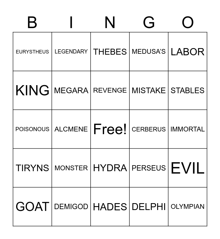 This bingo card has a free space and 30 words: DEMIGOD, ZEUS, ALCMENE, HERA, EURYSTHEUS, THEBES, MEGARA, HYDRA, CERBERUS, HADES, IMMORTAL, OLYMPIAN, DELPHI, LION, STABLES, SUPERHERO, PERSEUS, TIRYNS, MONSTER, LABOR, POISONOUS, UNDERWORLD, LEGENDARY, MISTAKE, KING, MEDUSA’S, EVIL, GOAT, REVENGE and GODLIKE.