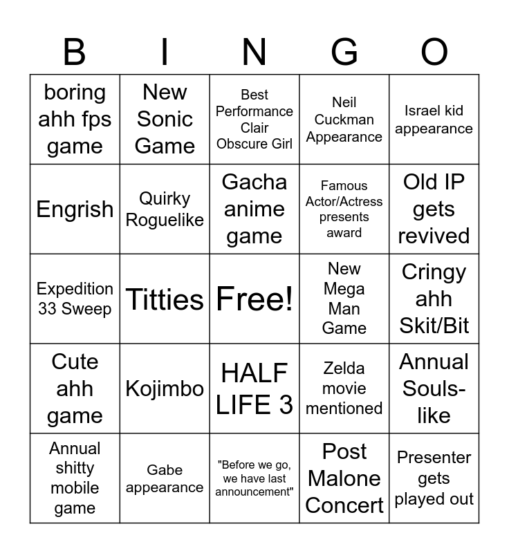 This bingo card has a free space and 24 words: Kojimbo, Gabe appearance, Gacha anime game, Annual shitty mobile game, Israel kid appearance, boring ahh fps game, Engrish, New Sonic Game, New Mega Man Game, HALF LIFE 3, Famous Actor/Actress presents award, Expedition 33 Sweep, Zelda movie mentioned, Annual Souls-like, Quirky Roguelike, Post Malone Concert, Cringy ahh Skit/Bit, Best Performance Clair Obscure Girl, Old IP gets revived, Titties, Presenter gets played out, Cute ahh game, Neil Cuckman Appearance and "Before we go, we have last announcement".