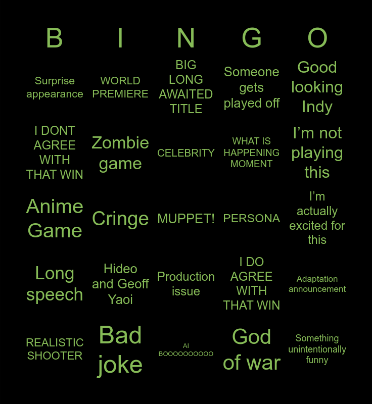 This bingo card has a free space and 24 words: Hideo and Geoff Yaoi, Bad joke, CELEBRITY, REALISTIC SHOOTER, Good looking Indy, Surprise appearance, I DONT AGREE WITH THAT WIN, WORLD PREMIERE, PERSONA, Production issue, WHAT IS HAPPENING MOMENT, Anime Game, I DO AGREE WITH THAT WIN, Adaptation announcement, Zombie game, God of war, I’m actually excited for this, BIG LONG AWAITED TITLE, I’m not playing this, Cringe, Something unintentionally funny, Long speech, Someone gets played off and AI BOOOOOOOOOO.