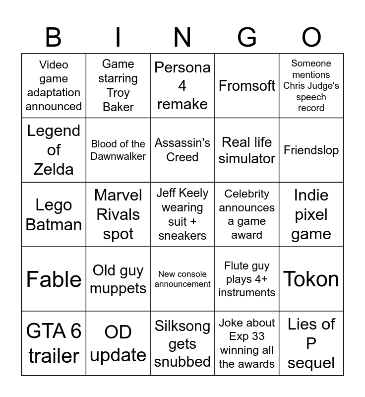 This bingo card has a free space and 24 words: Old guy muppets, OD update, Assassin's Creed, GTA 6 trailer, Someone mentions Chris Judge's speech record, Video game adaptation announced, Legend of Zelda, Game starring Troy Baker, Celebrity announces a game award, New console announcement, Real life simulator, Lego Batman, Flute guy plays 4+ instruments, Tokon, Blood of the Dawnwalker, Joke about Exp 33 winning all the awards, Indie pixel game, Persona 4 remake, Friendslop, Marvel Rivals spot, Lies of P sequel, Fable, Fromsoft and Silksong gets snubbed.