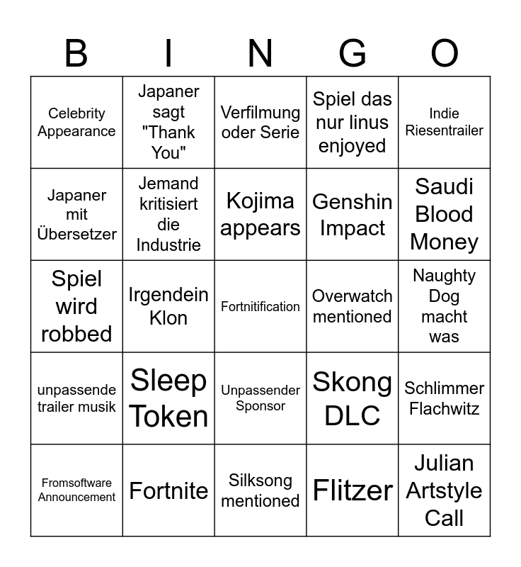 This bingo card has 25 words: Sleep Token, Silksong mentioned, Kojima appears, Fromsoftware Announcement, Indie Riesentrailer, Celebrity Appearance, Japaner mit Übersetzer, Japaner sagt "Thank You", Overwatch mentioned, Unpassender Sponsor, Genshin Impact, Spiel wird robbed, Skong DLC, Schlimmer Flachwitz, Jemand kritisiert die Industrie, Julian Artstyle Call, Naughty Dog macht was, Verfilmung oder Serie, Saudi Blood Money, Irgendein Klon, Fortnitification, Fortnite, unpassende trailer musik, Spiel das nur linus enjoyed and Flitzer.