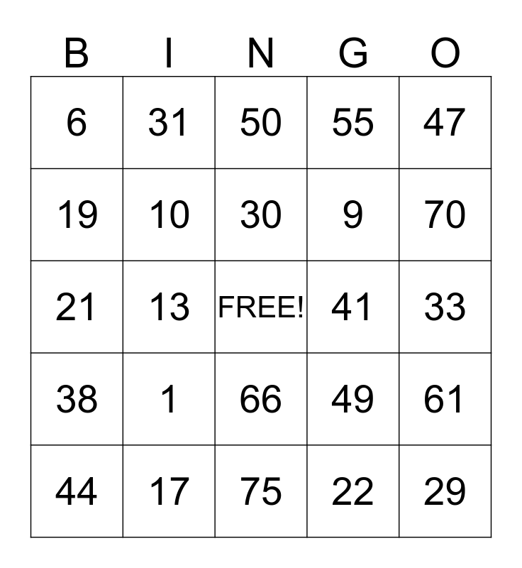 This bingo card has a free space and 24 words: 1, 17, 30, 44, 47, 6, 19, 31, 41, 66, 9, 21, 49, 61, 10, 22, 33, 50, 70, 13, 29, 38, 55 and 75.