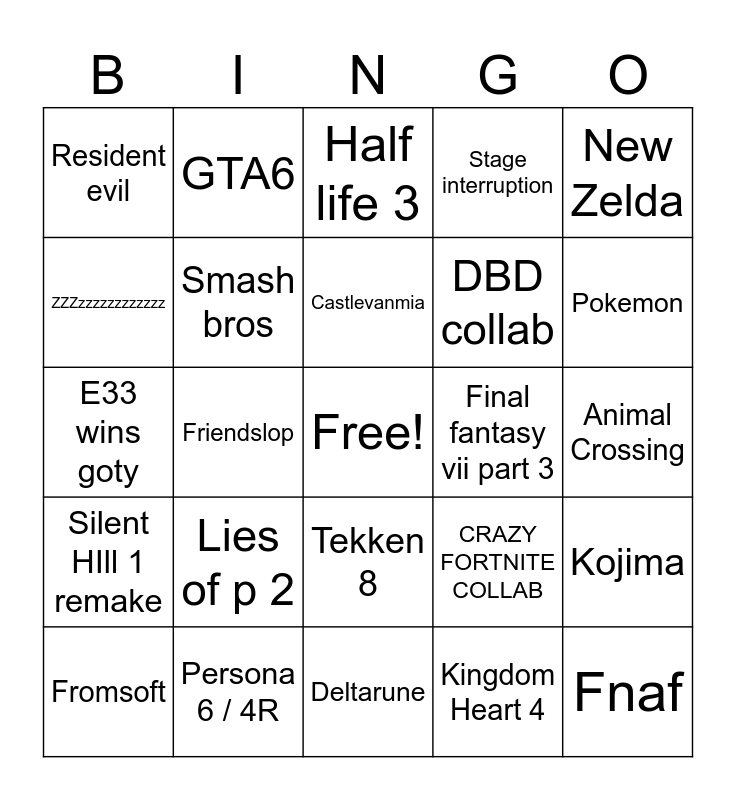 This bingo card has a free space and 24 words: Fromsoft, Lies of p 2, Castlevanmia, Kingdom Heart 4, New Zelda, Resident evil, GTA6, Half life 3, Final fantasy vii part 3, Animal Crossing, E33 wins goty, Smash bros, CRAZY FORTNITE COLLAB, Kojima, ZZZzzzzzzzzzzzz, Persona 6 / 4R, Deltarune, Stage interruption, Pokemon, Silent HIll 1 remake, Friendslop, Tekken 8, DBD collab and Fnaf.
