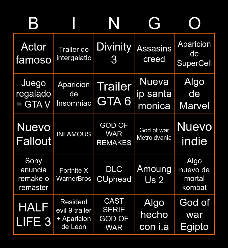 This bingo card has a free space and 24 words: Fortnite X WarnerBros, Resident evil 9 trailer + Aparicion de Leon, Trailer GTA 6, HALF LIFE 3, Aparicion de SuperCell, Actor famoso, Juego regalado = GTA V, Trailer de intergalatic, God of war Metroidvania, DLC CUphead, Nueva ip santa monica, Nuevo Fallout, Amoung Us 2, Algo nuevo de mortal kombat, Aparicion de Insomniac, Algo hecho con i.a, Nuevo indie, Divinity 3, Algo de Marvel, INFAMOUS, God of war Egipto, Sony anuncia remake o remaster, Assasins creed and CAST SERIE GOD OF WAR.