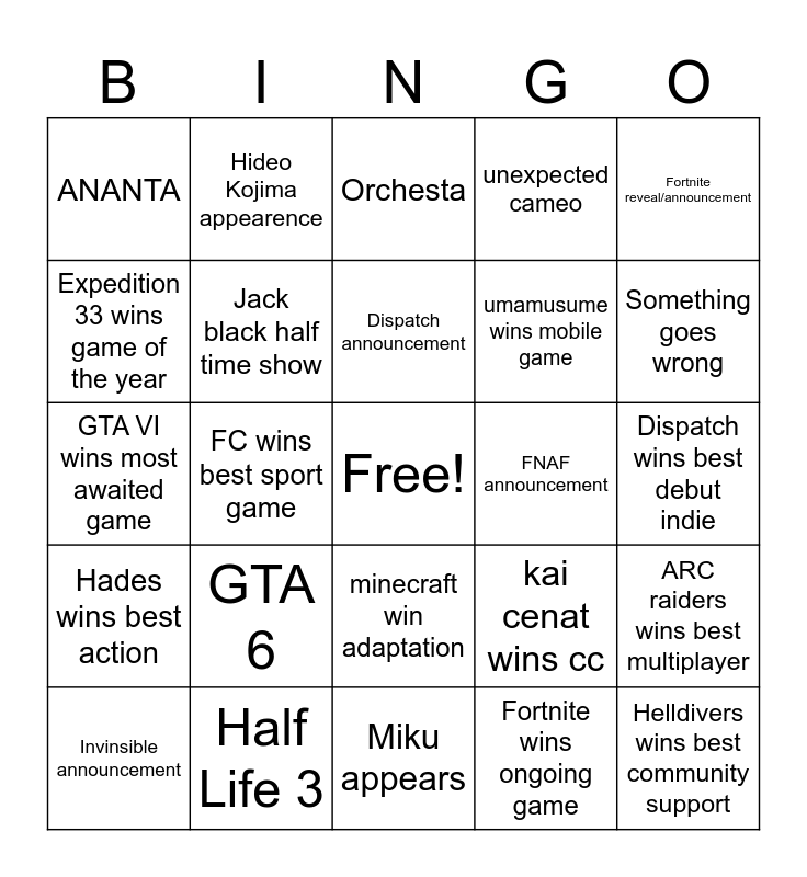 This bingo card has a free space and 24 words: GTA 6, Half Life 3, Dispatch announcement, Invinsible announcement, Fortnite reveal/announcement, ANANTA, Expedition 33 wins game of the year, Hideo Kojima appearence, FNAF announcement, minecraft win adaptation, umamusume wins mobile game, GTA VI wins most awaited game, kai cenat wins cc, ARC raiders wins best multiplayer, Jack black half time show, Fortnite wins ongoing game, Dispatch wins best debut indie, Orchesta, Something goes wrong, FC wins best sport game, Helldivers wins best community support, Hades wins best action, unexpected cameo and Miku appears.