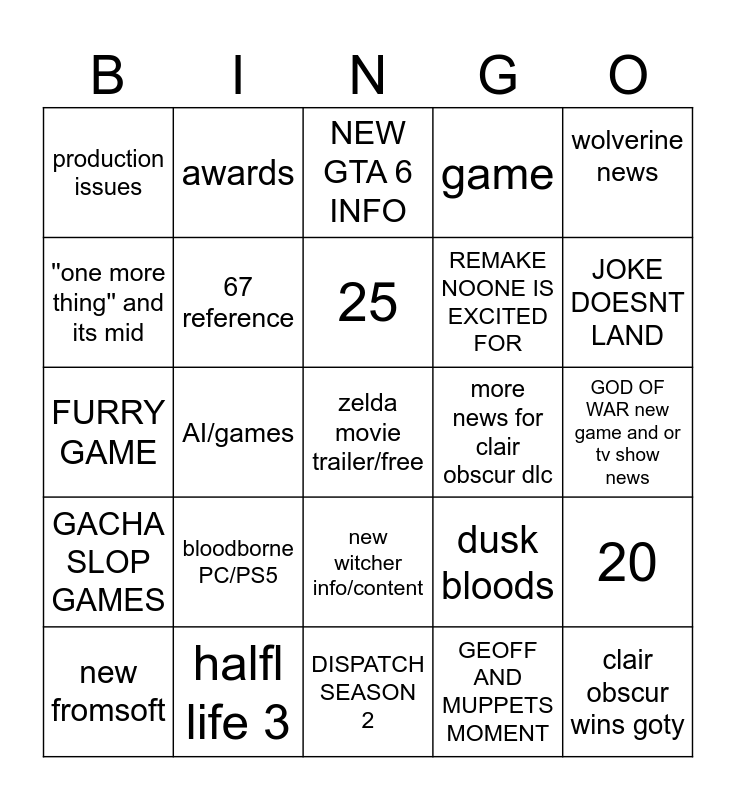 This bingo card has a free space and 29 words: new fromsoft, weeb games, AI/games, RIOT GAMES mentioned, production issues, NEW GTA 6 INFO, 67 reference, bloodborne PC/PS5, more news for clair obscur dlc, halfl life 3, GOD OF WAR new game and or tv show news, clair obscur wins goty, DISPATCH SEASON 2, GEOFF AND MUPPETS MOMENT, JOKE DOESNT LAND, RANDOM FAMOUS PEOPLE show up, new witcher info/content, GACHA SLOP GAMES, wolverine news, FURRY GAME, dusk bloods, NEW RE9 INFO, REMAKE NOONE IS EXCITED FOR, ''one more thing'' and its mid, game, awards, 20, 25 and oooo.