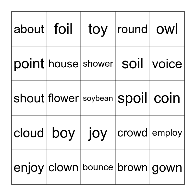 This bingo card has 25 words: boy, bounce, shower, enjoy, owl, about, point, foil, spoil, joy, soil, shout, crowd, employ, house, gown, coin, toy, voice, flower, soybean, clown, cloud, round and brown.