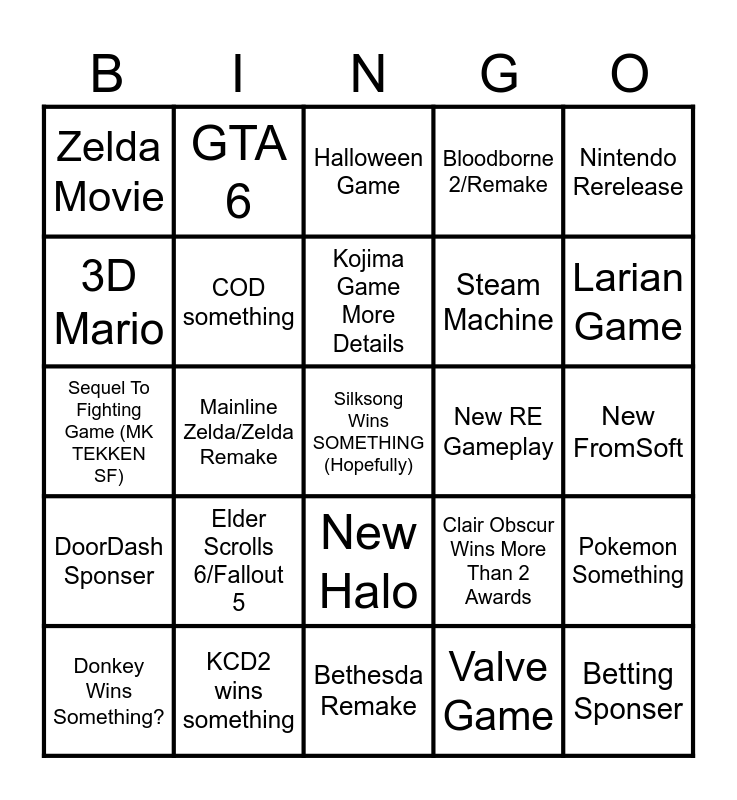 This bingo card has 25 words: Elder Scrolls 6/Fallout 5, Bethesda Remake, Kojima Game More Details, Donkey Wins Something?, Nintendo Rerelease, Zelda Movie, 3D Mario, GTA 6, New RE Gameplay, New Halo, Steam Machine, Sequel To Fighting Game (MK TEKKEN SF), Clair Obscur Wins More Than 2 Awards, Pokemon Something, COD something, Betting Sponser, New FromSoft, Halloween Game, Larian Game, Mainline Zelda/Zelda Remake, Silksong Wins SOMETHING (Hopefully), KCD2 wins something, DoorDash Sponser, Bloodborne 2/Remake and Valve Game.