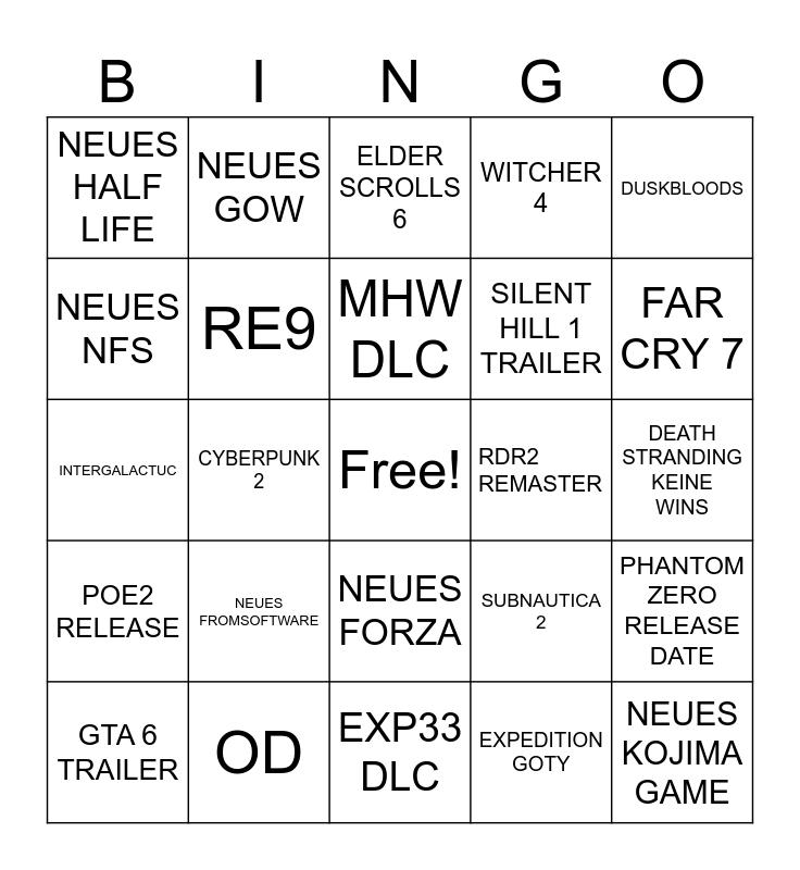 This bingo card has a free space and 24 words: GTA 6 TRAILER, NEUES FROMSOFTWARE, MHW DLC, EXPEDITION GOTY, DUSKBLOODS, NEUES HALF LIFE, NEUES GOW, ELDER SCROLLS 6, RDR2 REMASTER, DEATH STRANDING KEINE WINS, INTERGALACTUC, RE9, SUBNAUTICA 2, PHANTOM ZERO RELEASE DATE, NEUES NFS, OD, EXP33 DLC, WITCHER 4, FAR CRY 7, POE2 RELEASE, CYBERPUNK 2, NEUES FORZA, SILENT HILL 1 TRAILER and NEUES KOJIMA GAME.