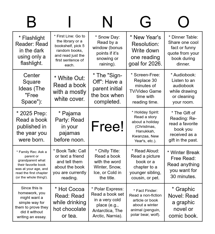 This bingo card has a free space and 30 words: * Hot Cocoa Read: Read while drinking hot chocolate or tea., * Fort Builder: Build a blanket fort and read inside it for 20 minutes., * Pajama Party: Read in your pajamas before noon., * Fuzzy Socks: Read while wearing your warmest socks or slippers., * Flashlight Reader: Read in the dark using only a flashlight., * Snow Day: Read by a window (bonus points if it’s snowing or raining)., * White Out: Read a book with a mostly white cover., * Chilly Title: Read a book with the word Winter, Snow, Ice, or Cold in the title., * Holiday Spirit: Read a story about a holiday (Christmas, Hanukkah, Kwanzaa, New Year's, etc.)., * Polar Express: Read a book set in a very cold place (e.g., Antarctica, The Arctic, Narnia)., * The Gift of Reading: Re-read a favorite book you received as a gift in the past., * Graphic Novel: Read a graphic novel or comic book., * Fact Finder: Read a non-fiction article or book about a winter animal (penguin, polar bear, wolf)., * Recipe Reader: Read a recipe for a winter treat (and maybe help make it!)., * Audiobook: Listen to an audiobook while drawing or cleaning your room., * News Anchor: Read a newspaper article or a kid-friendly news site (like Newsela or Time for Kids)., * Read Aloud: Read a picture book or a chapter to a younger sibling, cousin, or pet., * Family Rec: Ask a parent or grandparent what their favorite book was at your age, and read the first chapter (or the whole thing!)., * Book Talk: Call or text a friend and tell them about the book you are currently reading., * Dinner Table: Share one cool fact or funny quote from your book during dinner., * 2025 Prep: Read a book published in the year you were born., * The "Big" Book: Read a book with more than 150 pages., * First Line: Go to the library or a bookshelf, pick 5 random books, and read just the first sentence of each., * Screen-Free: Replace 30 minutes of TV/Video Game time with reading time., Center Square Ideas (The "Free Space"):, * New Year's Resolution: Write down one reading goal for 2026., * Winter Break Free Read: Read anything you want for 30 minutes., Since this is homework, you might want a simple way for them to prove they did it without writing an essay., * The "Sign-Off": Have a parent initial the box when completed. and * The "One-Word Reaction": Inside the bingo square, they have to write one word describing how that task made them feel (e.g., "Relaxed," "Hungry," "Interested")..