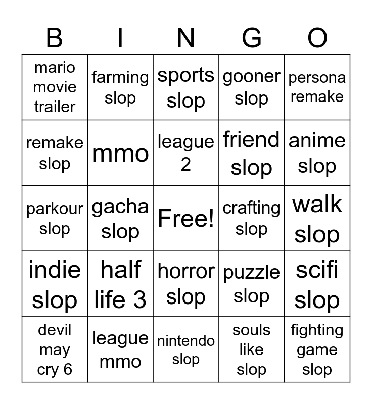 This bingo card has a free space and 24 words: half life 3, league mmo, league 2, devil may cry 6, persona remake, mario movie trailer, remake slop, farming slop, crafting slop, horror slop, friend slop, parkour slop, puzzle slop, scifi slop, mmo, souls like slop, walk slop, sports slop, anime slop, gacha slop, fighting game slop, indie slop, gooner slop and nintendo slop.