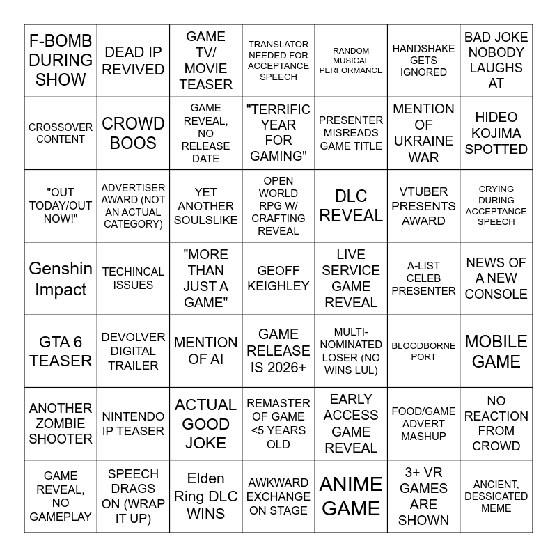 This bingo card has a free space and 48 words: GTA 6 TEASER, TECHINCAL ISSUES, Elden Ring DLC WINS, GAME RELEASE IS 2026+, PRESENTER MISREADS GAME TITLE, A-LIST CELEB PRESENTER, BAD JOKE NOBODY LAUGHS AT, GAME REVEAL, NO GAMEPLAY, ADVERTISER AWARD (NOT AN ACTUAL CATEGORY), "MORE THAN JUST A GAME", TRANSLATOR NEEDED FOR ACCEPTANCE SPEECH, RANDOM MUSICAL PERFORMANCE, VTUBER PRESENTS AWARD, CRYING DURING ACCEPTANCE SPEECH, Genshin Impact, NINTENDO IP TEASER, GAME TV/ MOVIE TEASER, OPEN WORLD RPG W/ CRAFTING REVEAL, EARLY ACCESS GAME REVEAL, HANDSHAKE GETS IGNORED, HIDEO KOJIMA SPOTTED, CROSSOVER CONTENT, DEAD IP REVIVED, GAME REVEAL, NO RELEASE DATE, ANIME GAME, MENTION OF UKRAINE WAR, NEWS OF A NEW CONSOLE, ANOTHER ZOMBIE SHOOTER, DEVOLVER DIGITAL TRAILER, YET ANOTHER SOULSLIKE, REMASTER OF GAME <5 YEARS OLD, DLC REVEAL, FOOD/GAME ADVERT MASHUP, NO REACTION FROM CROWD, F-BOMB DURING SHOW, SPEECH DRAGS ON (WRAP IT UP), MENTION OF AI, AWKWARD EXCHANGE ON STAGE, LIVE SERVICE GAME REVEAL, 3+ VR GAMES ARE SHOWN, MOBILE GAME, "OUT TODAY/OUT NOW!", CROWD BOOS, ACTUAL GOOD JOKE, "TERRIFIC YEAR FOR GAMING", MULTI-NOMINATED LOSER (NO WINS LUL), BLOODBORNE PORT and ANCIENT, DESSICATED MEME.
