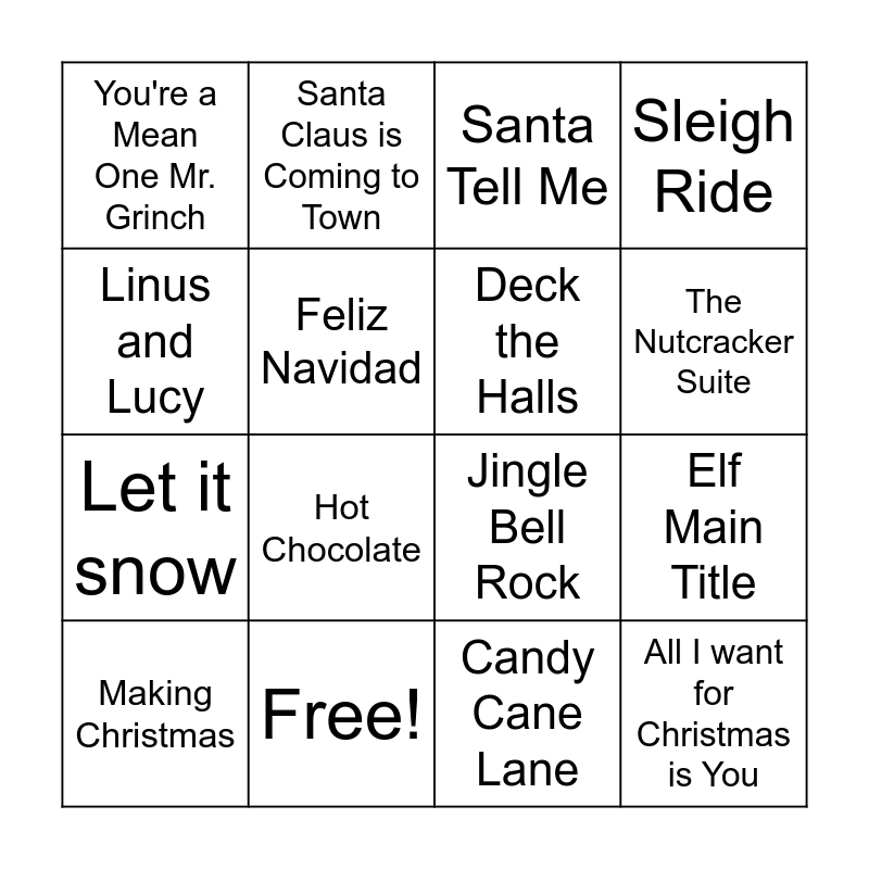 This bingo card has 22 words: Free!, I want a Hippopotamus for Christmas, Santa Claus is Coming to Town, Rudolf the Red Nose Reindeer, Feliz Navidad, Deck the Halls, You're a Mean One Mr. Grinch, Santa Tell Me, Jingle Bell Rock, All I want for Christmas is You, Let it snow, Sleigh Ride, Frosty the Snowman, Carol of the Bells, Candy Cane Lane, Rockin Around the Christmas Tree, Elf Main Title, Making Christmas, Hot Chocolate, Linus and Lucy, The Nutcracker Suite and Please Santa Don't Be Late.