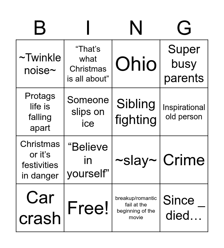 This bingo card has 28 words: Character has major heart change in very short time, Unnecessary CGI, Christmas or it’s festivities in danger, Character who’s so done with Christmas, Someone slips on ice, Ohio, “That’s what Christmas is all about”, Since _ died…, Free!, Santa, ~slay~, Super busy parents, Unlikely romance, Singing major plot point, “Believe in yourself”, Character who believes in Xmas magic, new parent figure, Sibling fighting, Inspirational old person, Before the clock strikes twelve…, ~Twinkle noise~, Weird slo mo, Car crash, Crime, breakup/romantic fail at the beginning of the movie, Protag has a huge apartment, Protags life is falling apart and Trying to appease family.