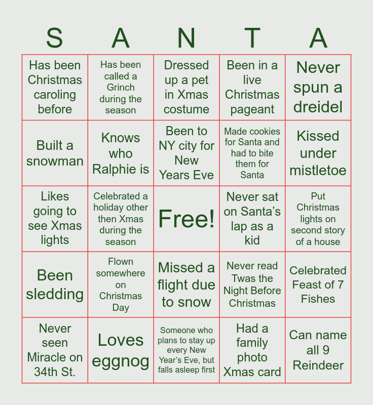This bingo card has a free space and 29 words: Never seen Miracle on 34th St., Stinks at wrapping presents, Celebrated a holiday other then Xmas during the season, Been in snowball fight with real snow, Has been Christmas caroling before, Dressed up a pet in Xmas costume, Knows who Ralphie is, Flown somewhere on Christmas Day, Never sat on Santa’s lap as a kid, Loves eggnog, Put Christmas lights on second story of a house, Can name all 9 Reindeer, Someone who plans to stay up every New Year’s Eve, but falls asleep first, Had a family photo Xmas card, Kissed under mistletoe, Has worn Xmas matching pajamas, Missed a flight due to snow, Been sledding, Never spun a dreidel, Likes going to see Xmas lights, Never read Twas the Night Before Christmas, Finished Christmas shopping before Dec. 1st., Made cookies for Santa and had to bite them for Santa, Built a snowman, Been in a live Christmas pageant, Has been called a Grinch during the season, Celebrated Feast of 7 Fishes, Been to NY city for New Years Eve and Has eaten fruitcake.