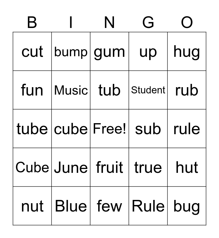 This bingo card has a free space and 61 words: Use, Blue, Few, Cube, Rule, Fruit, Music, Future, Student, Computer, up, sun, fun, run, cup, cut, bug, hug, mud, tub, sub, gum, nut, hut, bun, sum, mug, jug, rub, cub, pup, duck, luck, jump, bump, use, cute, cube, mule, tube, tune, June, rule, blue, true, glue, huge, super, suit, fruit, few, new, you, flu, move, zoom, food, moon, pool, cool and chunk.