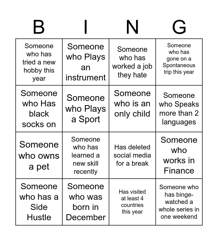 This bingo card has 16 words: Someone who has a Side Hustle, Someone who was born in December, Someone who has worked a job they hate, Someone who has gone on a Spontaneous trip this year, Someone who Has black socks on, Someone who Plays an instrument, Has deleted social media for a break, Someone who works in Finance, Someone who has tried a new hobby this year, Someone who Plays a Sport, Has visited at least 4 countries this year, Someone who Speaks more than 2 languages, Someone who owns a pet, Someone who has learned a new skill recently, Someone who is an only child and Someone who has binge-watched a whole series in one weekend.