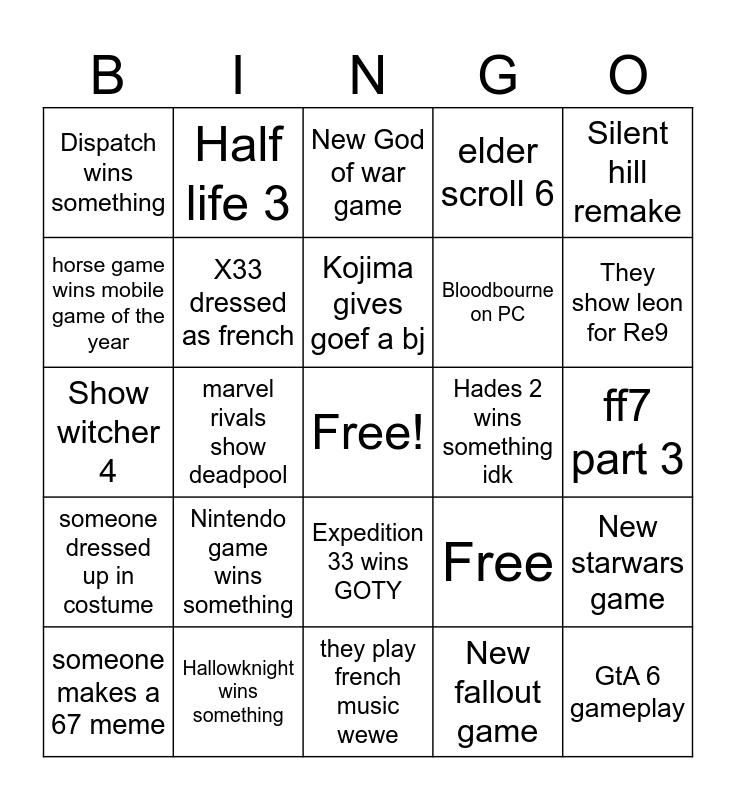 This bingo card has a free space and 25 words: Nintendo game wins something, they play french music wewe, Kojima gives goef a bj, someone makes a 67 meme, Silent hill remake, Dispatch wins something, horse game wins mobile game of the year, Half life 3, Hades 2 wins something idk, Expedition 33 wins GOTY, Bloodbourne on PC, Show witcher 4, Free, New starwars game, X33 dressed as french, New Yakuza game, ff7 part 3, New God of war game, They show leon for Re9, marvel rivals show deadpool, GtA 6 gameplay, Hallowknight wins something, someone dressed up in costume, elder scroll 6 and New fallout game.