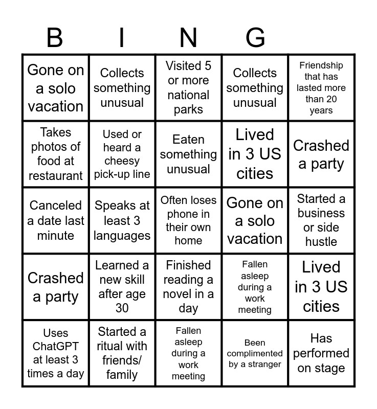 This bingo card has 66 words: Speaks at least 3 languages, Gone on a solo vacation, Adventure Sport, Lived in 3 US cities, Learned a new skill after age 30, Crashed a party, Collects something unusual, Has performed on stage, Eaten something unusual, Lost luggage when traveling, Finished reading a novel in a day, Often loses phone in their own home, Started a business or side hustle, Friendship that has lasted more than 20 years, Uses ChatGPT at least 3 times a day, Takes photos of food at restaurant, Speaks at least 3 languages, Gone on a solo vacation, Adventure Sport, Lived in 3 US cities, Learned a new skill after age 30, Crashed a party, Collects something unusual, Has performed on stage, Started a business or side hustle, Eaten something unusual, Lost luggage when traveling, Finished reading a novel in a day, Often loses phone in their own home, Friendship that has lasted more than 20 years, Uses ChatGPT at least 3 times a day, Takes photos of food at restaurant, Has created a meme or a reel, Visited 5 or more national parks, Fallen asleep during a work meeting, Started a ritual with friends/ family, Went on a blind date, Canceled a date last minute, Been complimented by a stranger, Lied about your age, Used or heard a cheesy pick-up line, Speaks at least 3 languages, Gone on a solo vacation, Adventure Sport, Lived in 3 US cities, Learned a new skill after age 30, Crashed a party, Collects something unusual, Has performed on stage, Started a business or side hustle, Eaten something unusual, Lost luggage when traveling, Finished reading a novel in a day, Often loses phone in their own home, Friendship that has lasted more than 20 years, Uses ChatGPT at least 3 times a day, Takes photos of food at restaurant, Has created a meme or a reel, Visited 5 or more national parks, Fallen asleep during a work meeting, Started a ritual with friends/ family, Went on a blind date, Canceled a date last minute, Been complimented by a stranger, Lied about your age and Used or heard a cheesy pick-up line.