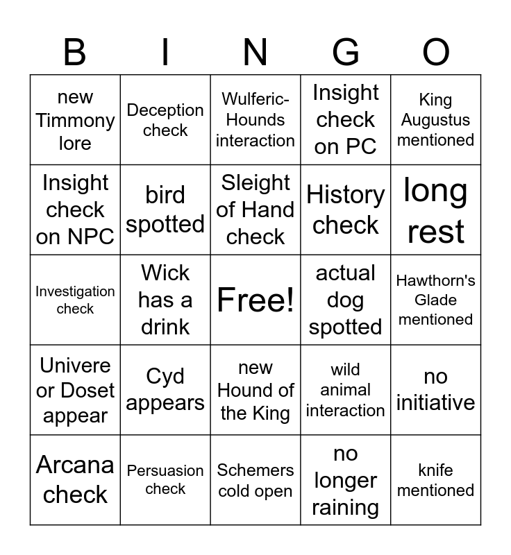 This bingo card has a free space and 31 words: Schemers cold open, Seekers cold open, Wick has a drink, new Torn Banner lore, new Timmony lore, Wulferic-Hounds interaction, bird spotted, wild animal interaction, actual dog spotted, no longer raining, Hawthorn's Glade mentioned, knife mentioned, Cyd found, Cyd rescued, long rest, initiative, no initiative, Cyd appears, Univere or Doset appear, new Hound of the King, King Augustus mentioned, Divine Sense, Arcana check, Deception check, History check, Insight check on NPC, Insight check on PC, Investigation check, Persuasion check, Sleight of Hand check and Survival check.
