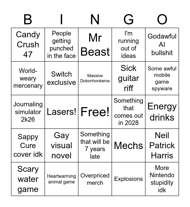 This bingo card has a free space and 24 words: Gay visual novel, Heartwarming animal game, Massive Dobonhonkeros, Scary water game, Godawful AI bullshit, Candy Crush 47, World-weary mercenary, People getting punched in the face, Something that comes out in 2028, Something that will be 7 years late, Sick guitar riff, Journaling simulator 2k26, Mechs, Neil Patrick Harris, Switch exclusive, Explosions, Energy drinks, Mr Beast, Some awful mobile game spyware, Lasers!, More Nintendo stupidity idk, Sappy Cure cover idk, I'm running out of ideas and Overpriced merch.