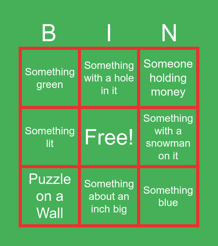 This bingo card has a free space and 36 words: Gnome, Something White, Photo of Tom, Puzzle on a Wall, Word Ornament, Ice Skater in Village, Something about an inch big, A Character, Something blue, Photo of Michelle, Favorite Village Piece, Something lit, Something red, Picture Ornament, Photo of Mark, Something green, Wood Ornament, Something about a foot wide, Something metal, Someone holding money, Someone eating, Something with the number zero, Something triangle, Something you shouldn't touch, Something that is only three colors, Something with a hole in it, Something from a different country, Something that has a scent, Something with Santa on it, Something with a snowman on it, Something that shouldn't be left outside, Something that is six letters long, Something sparkly, Something that is made of 2 pieces, Something with a handle and Something homemade.