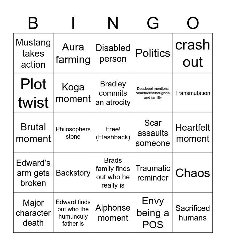 This bingo card has a free space and 24 words: Backstory, Edward finds out who the humunculy father is, Bradley commits an atrocity, Major character death, crash out, Mustang takes action, Plot twist, Aura farming, Scar assaults someone, Brads family finds out who he really is, Deadpool mentions Nina/tucker/houghes/ and familly, Brutal moment, Traumatic reminder, Chaos, Koga moment, Envy being a POS, Heartfelt moment, Disabled person, Transmutation, Philosophers stone, Sacrificed humans, Edward’s arm gets broken, Politics and Alphonse moment.