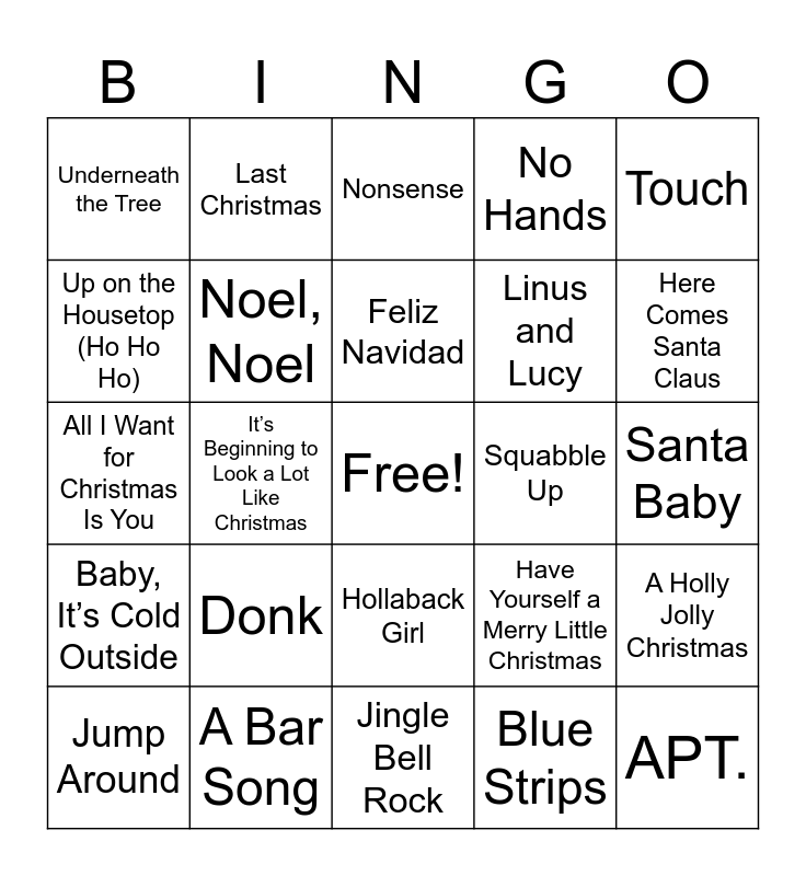This bingo card has a free space and 44 words: Glamorous, APT., Last Resort, Jump Around, Blue, Blue Strips, Nonsense, Apache, Touch, A Bar Song, No Hands, Squabble Up, Hollaback Girl, Donk, Teenage Dirtbag, Jingle Bell Rock, Let It Snow! Let It Snow! Let It Snow!, All I Want for Christmas Is You, The Christmas Song (Merry Christmas to You), Here Comes Santa Claus, Last Christmas, Sleigh Ride, Frosty the Snowman, Underneath the Tree, Santa Claus Is Coming to Town, Santa Baby, Blue Christmas, Rockin’ Around the Christmas Tree, Have Yourself a Merry Little Christmas, Baby, It’s Cold Outside, Santa, Can’t You Hear Me, A Holly Jolly Christmas, It’s the Most Wonderful Time of the Year, Christmas, It’s Beginning to Look a Lot Like Christmas, Run Rudolph Run, J-I-N-G-L-E B-E-L-L-S, Little Saint Nick, Feliz Navidad, Up on the Housetop (Ho Ho Ho), Linus and Lucy, Deck the Halls, Noel, Noel and Santa Tell Me.