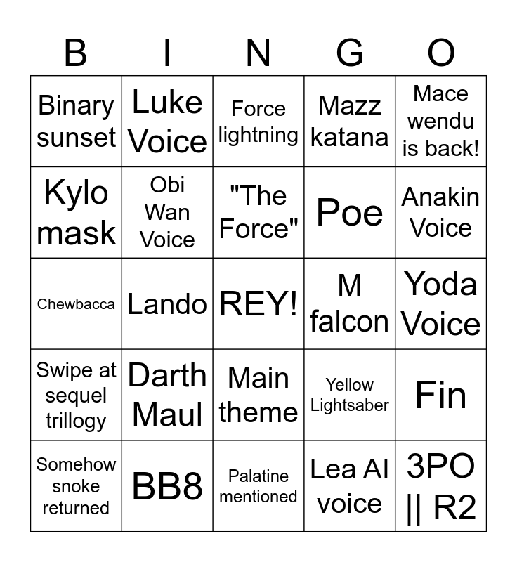 This bingo card has a free space and 24 words: Darth Maul, BB8, "The Force", Somehow snoke returned, Mace wendu is back!, Binary sunset, Kylo mask, Luke Voice, M falcon, Main theme, Poe, Chewbacca, Yellow Lightsaber, Fin, Obi Wan Voice, Lea AI voice, Yoda Voice, Force lightning, Anakin Voice, Lando, 3PO || R2, Swipe at sequel trillogy, Mazz katana and Palatine mentioned.