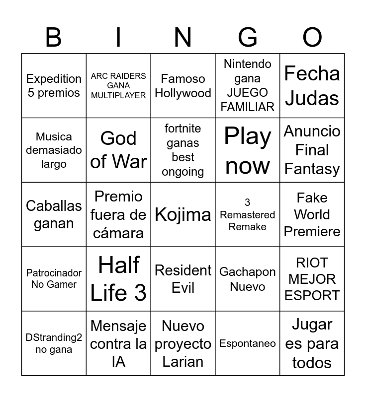 This bingo card has a free space and 29 words: DStranding2 no gana, GTA V, Premio fuera de cámara, Silksong no gana nada, Expedition 5 premios, Famoso Hollywood, God of War, Half Life 3, 3 Remastered Remake, Mensaje contra la IA, Fake World Premiere, Jugar es para todos, Nuevo proyecto Larian, Espontaneo, Anuncio Final Fantasy, LEGO, Resident Evil, Patrocinador No Gamer, Fecha Judas, Caballas ganan, Gachapon Nuevo, Trailer Adaptacion Cine, Play now, Musica demasiado largo, Nintendo gana JUEGO FAMILIAR, ARC RAIDERS GANA MULTIPLAYER, RIOT MEJOR ESPORT, fortnite ganas best ongoing and TOD HOWARD.