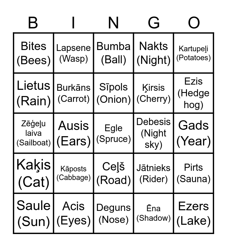 This bingo card has 30 words: Acis (Eyes), Adata (Needle), Ausis (Ears), Bikses (Pants), Bites (Bees), Bumba (Ball), Burkāns (Carrot), Ceļš (Road), Debesis (Night sky), Deguns (Nose), Gads (Year), Egle (Spruce), Ēna (Shadow), Ezers (Lake), Ezis (Hedge hog), Grāmata (Book), Jātnieks (Rider), Kaķis (Cat), Kāposts (Cabbage), Kartupeļi (Potatoes), Zēģeļu laiva (Sailboat), Kurpes (Shoes), Lapsene (Wasp), Ķirsis (Cherry), Lietus (Rain), Nakts (Night), Pirts (Sauna), Saule (Sun), Sīpols (Onion) and Bērzs (Birch tree).
