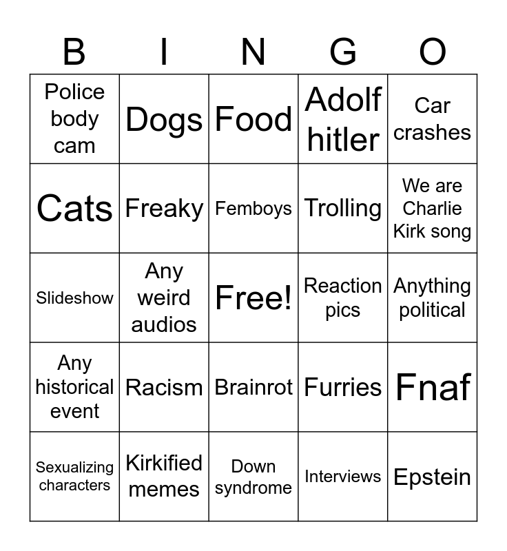 This bingo card has a free space and 24 words: Racism, Kirkified memes, Femboys, Sexualizing characters, Car crashes, Police body cam, Cats, Dogs, Reaction pics, Brainrot, Trolling, Slideshow, Furries, Fnaf, Freaky, Interviews, Anything political, Food, We are Charlie Kirk song, Any weird audios, Epstein, Any historical event, Adolf hitler and Down syndrome.