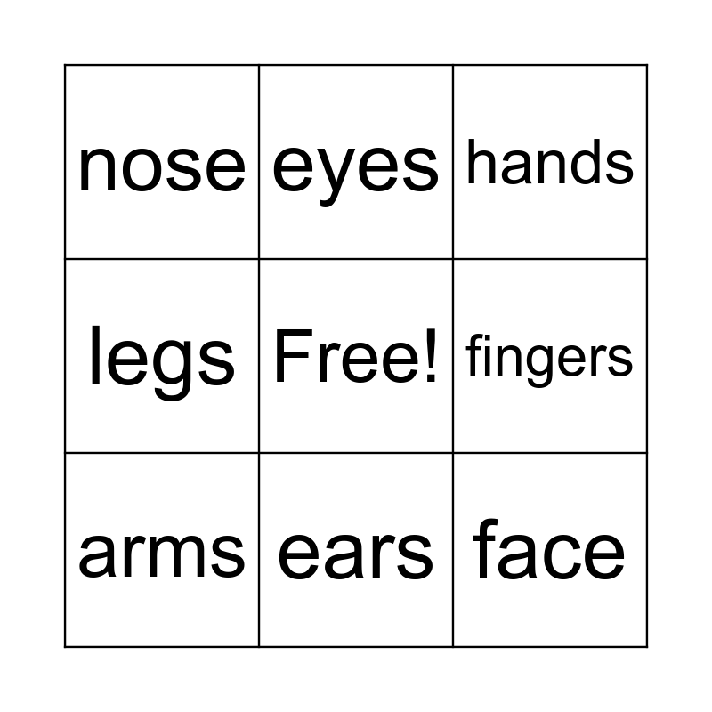 This bingo card has a free space and 8 words: fingers, hands, eyes, arms, nose, face, legs and ears.
