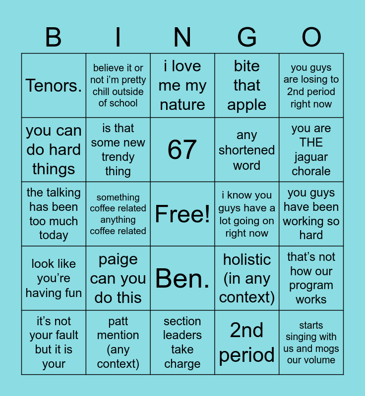 This bingo card has a free space and 24 words: it’s not your fault but it is your, paige can you do this, 67, 2nd period, you guys are losing to 2nd period right now, Tenors., believe it or not i’m pretty chill outside of school, i love me my nature, i know you guys have a lot going on right now, you guys have been working so hard, the talking has been too much today, is that some new trendy thing, holistic (in any context), that’s not how our program works, you can do hard things, patt mention (any context), section leaders take charge, bite that apple, you are THE jaguar chorale, look like you’re having fun, something coffee related anything coffee related, Ben., any shortened word and starts singing with us and mogs our volume.