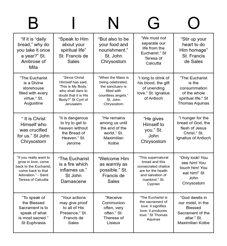 This bingo card has a free space and 24 words: “The Eucharist is a fire which inflames us.” St John Damascene, “Your actions may give proof to all of His Presence.” St. Francis de Sales, “When the Mass is being celebrated, the sanctuary is filled with countless angels.” St. John Chrysostom, “To speak of the Blessed Sacrament is to speak of what is most sacred.” St Euphrasia, “Stir up your heart to do Him homage” St. Francis de Sales, “If it is “daily bread,” why do you take it once a year?” St. Ambrose of Mila, “The Eucharist is a Divine storehouse filled with every virtue.” St. Augustine, “Speak to Him about your spiritual life” St. Francis de Sales, “He gives Himself to you.” St. John Chrysostom, “Welcome Him as warmly as possible.” St. Francis de Sales, “I long to drink of his blood, the gift of unending love.” St. Ignatius of Antioch, “ It is Christ Himself who was crucified for us.” St John Chrysostom, “This supernatural bread and this consecrated chalice are for the health and salvation of mankind.” St. Cyprian, “Only look! You see him! You touch him! You eat him!” St John Chrysostom, “Since Christ Himself has said, ‘This is My Body,’ who shall dare to doubt that it is His Body?” St Cyril of Jerusalem, “The Eucharist is the sacrament of love: it signifies love, it produces love.” St Thomas Aquinas, “I hunger for the bread of God, the flesh of Jesus Christ.” St. Ignatius of Antioch, “But also to be your food and nourishment.” St. John Chrysostom, “The Eucharist is the consummation of the whole spiritual life.” St Thomas Aquinas, “It is dangerous to try to get to heaven without the Bread of Heaven.” St. Jerome, “God dwells in our midst, in the Blessed Sacrament of the altar.” St. Maximilian Kolbe, “If you really want to grow in love, come back to the Eucharist, come back to that Adoration.” - Saint Teresa of Calcutta, “We must not separate our life from the Eucharist.” St Teresa of Calcutta and “Receive Communion often, very often.” St. Therese of Lisieux.