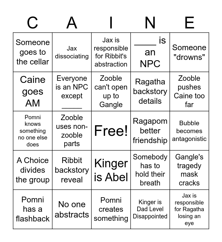 This bingo card has a free space and 24 words: Ribbit backstory reveal, No one abstracts, Zooble can't open up to Gangle, Pomni has a flashback, Someone "drowns", Someone goes to the cellar, Caine goes AM, Jax dissociating, Ragapom better friendship, Kinger is Abel, Ragatha backstory details, Pomni knows something no one else does, Somebody has to hold their breath, Gangle's tragedy mask cracks, Everyone is an NPC except _____, Kinger is Dad Level Disappointed, Bubble becomes antagonistic, Jax is responsible for Ribbit's abstraction, Zooble pushes Caine too far, Zooble uses non-zooble parts, Jax is responsible for Ragatha losing an eye, A Choice divides the group, ____ is an NPC and Pomni creates something.