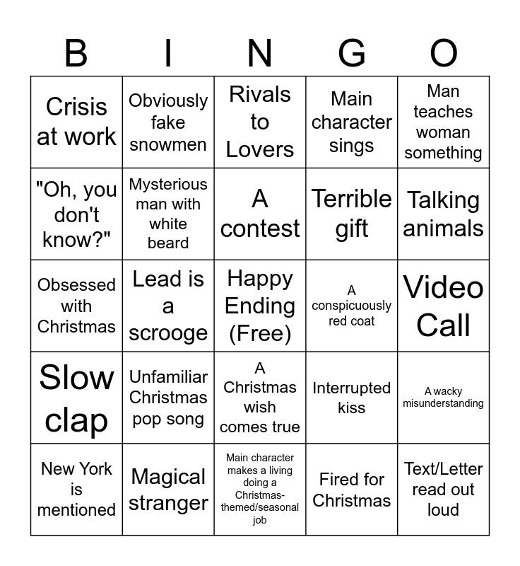 This bingo card has a free space and 189 words: Whimsical or magical old person, Traumatic Brain Injury/Amnesia, Ice skating, sledding, or skiing, Last name of Winter, Frost, Kringle, or Claus, Faking a Relationship (or lack of one), Family Recipe, The meaning of Christmas, Child knows best, Country music, Mistletoe, Office party, Character goes back to hometown, Someone is royal or extremely rich, Plaid/Flannel, A conspicuously red coat, A Christmas sweater, A Christmas wish comes true, It's a Christmas miracle, A magic trinket or object, Snow in an unusual climate, Decorating for Christmas, Picking out a Christmas tree, Working at a Soup Kitchen, God, Jesus, or Church mentioned, A wacky misunderstanding, An awkward almost kiss, Aloof Partner, Character changes personality, Animal with human-level intelligence, Real life reindeer, Scene in a Diner, Reference to streaming media/Netflix, Deceased spouse or parent, Small town better than big city, Generic made-up town name, Hot cocoa, Christmas cookies, Bumbling henchman, Obvious product placement, Klutzy moment, Wacky family visit, Blonde hair blue eyes main character, Big promotion at a dream job, A not-so-surprising twist, Caroling, Fired for Christmas, "It's snowing!", Instant job offer, Santa has a child, Small town business in trouble, Crisis at work, Concerned parent, Kids in costumes, Scheming, Weather interferes, Someone drives a truck, A Christmas play or concert, New York is mentioned, Character(s) with a holiday name, Snowball fight, Mysterious man with white beard, Scrappy female lead, Secret Identity, Career Indecision, Horseback riding, Terrible gift, Scene at the North Pole, Text/Letter read out loud, Christmas tree lighting ceremony, Lead is a scrooge, Precocious child plays wingman, Orchestra/band playing Christmas music, Unfamiliar Christmas pop song, Mall Santa/Elf, Sassy best friend, Woman teaches man something, Man teaches woman something, Heartfelt convo with mom, Awkward meal, Interrupted flight plans, Wearing an apron, Engagement, Parade, Someone has sworn off love, Someone playing matchmaker, Beautifully wrapped gifts, Plot hole, Talking animals, Character called a Grinch or Scrooge, Time loop, Obsessed with Christmas, Mistaken for Couple, Childhood Sweethearts, Horse-drawn Carriage, Local news, Sick in bed, Car accident, Advice from Santa, Past trauma related to Christmas, Magical stranger, Filmed in Canada, Romantic cooking scene, Interrupted kiss, Small town in trouble, Single parent, A contest, Child that talks like a grown-up, Car trouble, Pageant, Internal monologue on the outside, Charming inn, Rivals to Lovers, Holiday pun, Slow dance, Exposition dump, Shirtless!, Horse-drawn carriage, Slow clap, Very fake computer/TV UI, Trapped together, Magic is real, Ornament breaking, Obviously fake snow, Major Red Flags, Odd family custom, Inconvenient trip, Charity/Community Event, Opening monologue, Side characters get a romance, ...and everybody clapped, Reference to another Christmas movie, Letter to Santa, Wishing for someone else to fall in love for Christmas, Meddlesome neighbor, Drinking from empty cups, Sickly family member, Recognizable actor, Main character sings, "I have a confession to make", This film seems oddly familiar, Awkward hard cut for commercial break, Animated Opening, Important Snowglobe, Dramatic speech, Burnt food, High-power executive, Interrupted first kiss, "Santa isn't real", "Santa is real", Sparkle SFX, Bad child actor(s), Obviously fake snowmen, Wardrobe malfunction, Real estate transaction, Main character makes a living doing a Christmas-themed/seasonal job, Badly performed classic Christmas song, Public trauma dumping, Baker, Party Planner, or Small Biz Main Character, Actor from the 80s/90s, Collision Meet-Cute, Children are The Worst, Children are The Best, Dog, Shitty Ex, First kiss at the end of the movie, Very Gay Character, Christmas Market, "You're not who I thought you would be", Not liking Christmas makes you WEIRD, Unreasonably short timeline, The most important thing is Family™, Movie is a vehicle for performer's xmas album, Evil Business, Ex realizes what they're missing, Lack of Chemistry between lead actors, "Oh, you don't know?", Main character freakishly likable, "Wait, you've never [blank]??", Blatant invasion of privacy, Dead parent was saintly, Video Call, Social media plot point, Paparazzi, Prickly outside, soft inside, Loner lead, Oh no, they're hot, Moving on a whim, Montage and Girl Power!!!!.