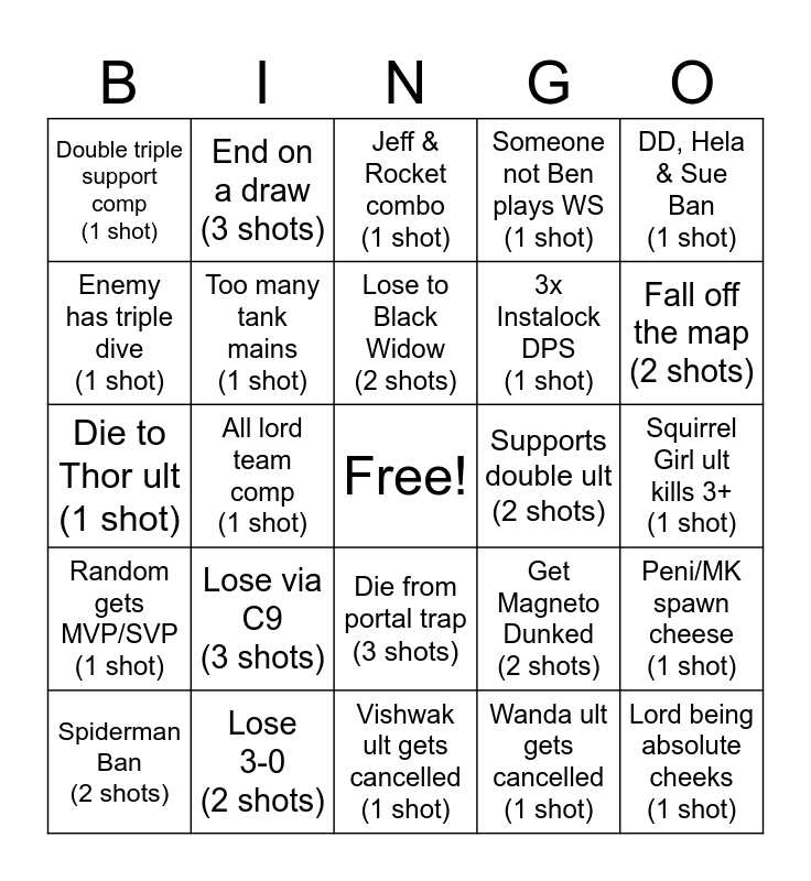 This bingo card has a free space and 24 words: Lose via C9 (3 shots), Lose 3-0 (2 shots), Lose to Black Widow (2 shots), Spiderman Ban (2 shots), DD, Hela & Sue Ban (1 shot), Double triple support comp (1 shot), Enemy has triple dive (1 shot), End on a draw (3 shots), Supports double ult (2 shots), Die from portal trap (3 shots), 3x Instalock DPS (1 shot), Die to Thor ult (1 shot), Get Magneto Dunked (2 shots), Peni/MK spawn cheese (1 shot), Too many tank mains (1 shot), Wanda ult gets cancelled (1 shot), Squirrel Girl ult kills 3+ (1 shot), Jeff & Rocket combo (1 shot), Fall off the map (2 shots), All lord team comp (1 shot), Lord being absolute cheeks (1 shot), Random gets MVP/SVP (1 shot), Someone not Ben plays WS (1 shot) and Vishwak ult gets cancelled (1 shot).