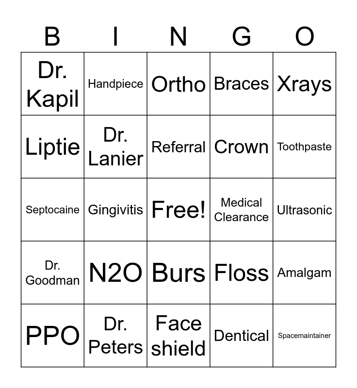 This bingo card has a free space and 62 words: Dr. Tucker, Dr. Peters, Dr. Shen, Dr. Goodman, Dr. Boese, Dr. Atwal, Dr. Lanier, Filling, Crown, Extraction, Braces, Pulpotemy, Liptie, Huggie, Dr. Saad, Dr. Kapil, Spacemaintainer, Xrays, PANO, Referral, Medical Clearance, Ortho, PPO, Dentical, Mootilda, GA, ORAL SURG, Composite, Amalgam, Decay, PPE, Lab coat, Sani Clothes, Autoclave, Ultrasonic, Handpiece, Prophy, Fluoride, Gingivitis, Lidocaine, Septocaine, Isolite, N2O, Toothbrush, Toothpaste, Floss, Expose and bond, Curing light, Osha, Gloves, Burs, Face shield, Supernumerary, Tongue tie, Wisdom teeth, Calculus, Hipaa, Dentrix, Appointment, Comprehensive exam, Periodic exam and CRA.
